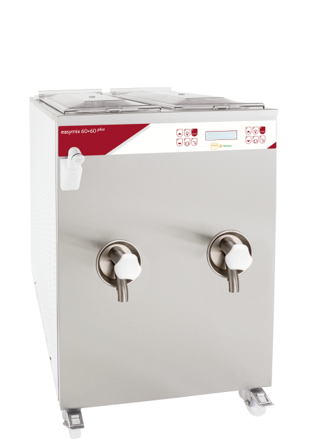 Easymix plus is the pasteurizer for the production of gelato mixes, easy to use and ensuring the utmost hygiene. It is equipped with 3 automatic pasteurizing programs.Thanks to the double heating system, consumptions are reduced.Thanks to the double compressor and the double condenser, Easymix 60 + 60 plus is equipped with two independent tanks. This allows to work without interruptions.